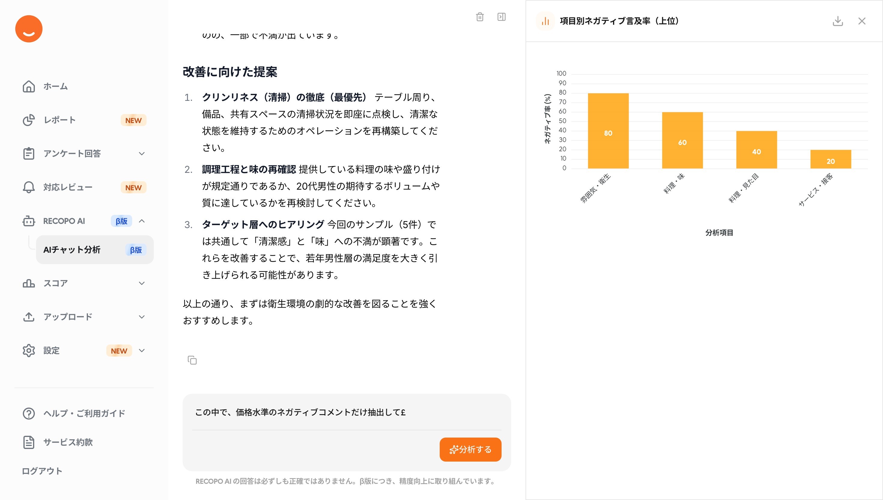 [スクリーンショット: サイドバーメニューでRECOPO AI > AIチャット分析を開いた状態]